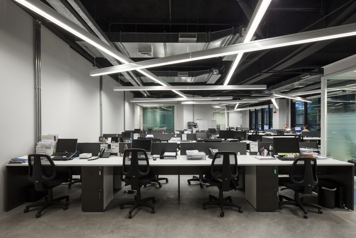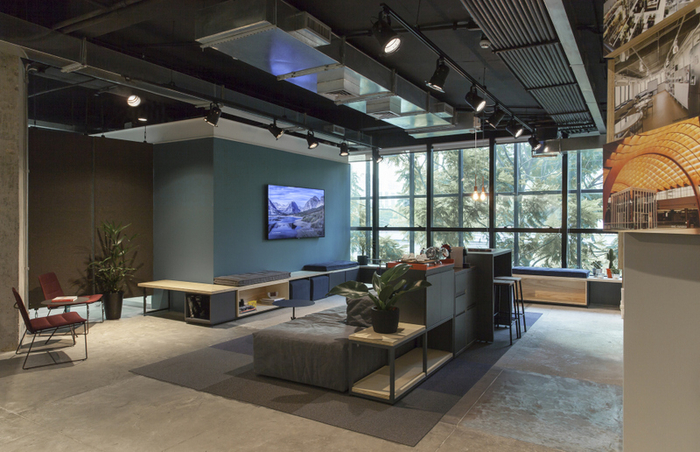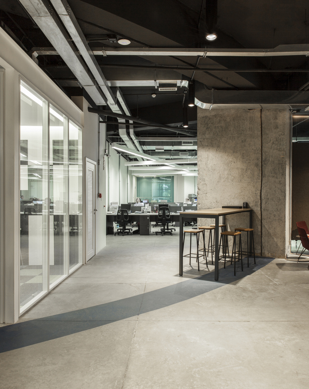 面(miàn)積:500m2,采用工業風裝修風格,其中經(jīng)理室、會議室、财務室用鋁材玻璃隔斷分成(chéng)獨立的區域,其它辦公區域分敞開(kāi)式的辦公區,頂面(miàn)噴黑,用各式燈作爲裝飾效果,地面(miàn)爲仿古磚,牆面(miàn)有的爲原牆體刷膠水、部分牆體輔用色彩以緻于牆面(miàn)不單調。整體工業風格濃烈。